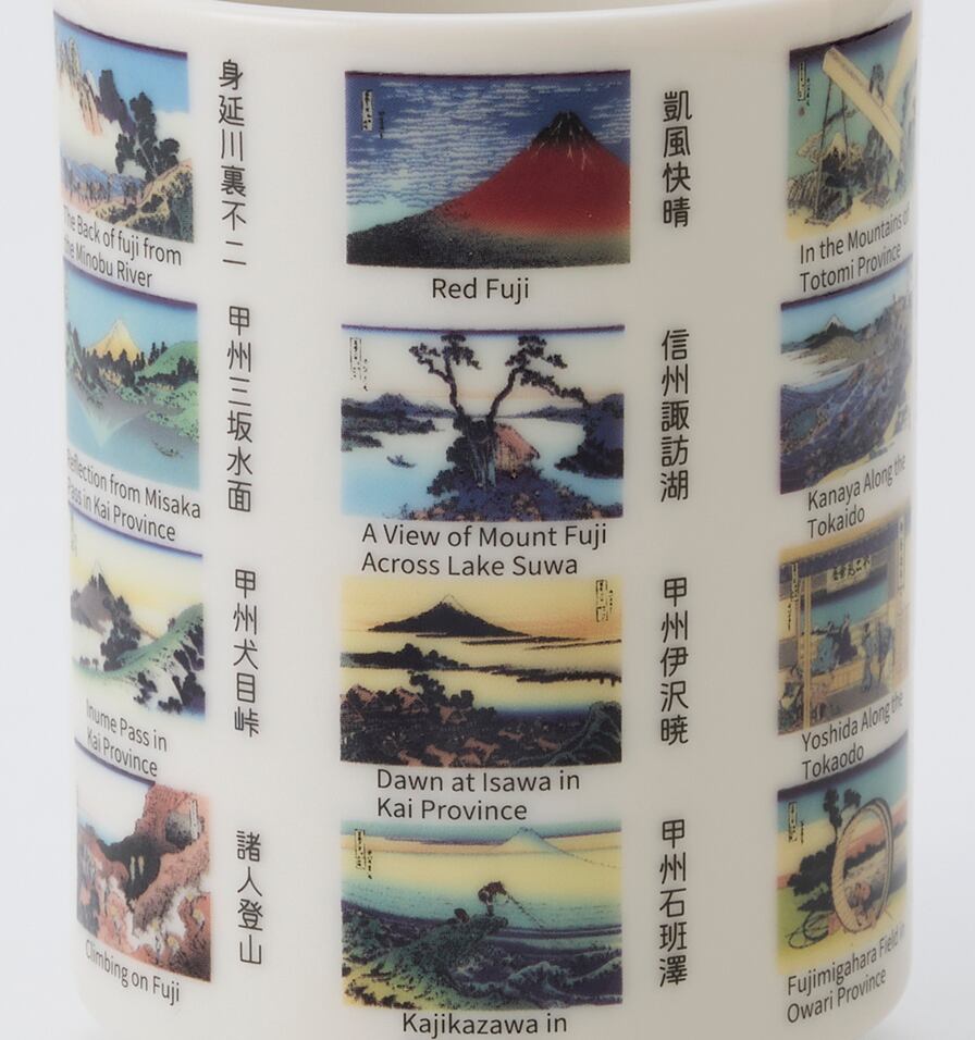 壱の湯呑ではその内、代表作、凱風快晴を筆頭に信州諏訪湖、相州江の島、箱根、甲州、遠江等、江戸市中以外の地方から富士の図版を中心に23作品をレイアウトしました。