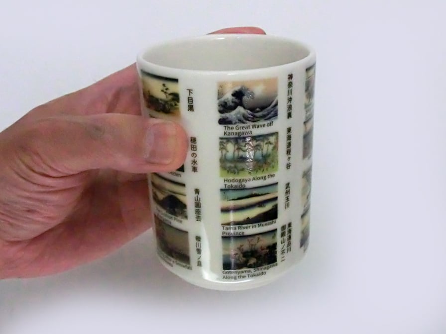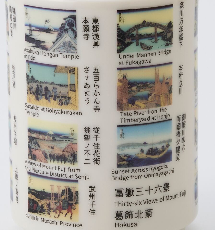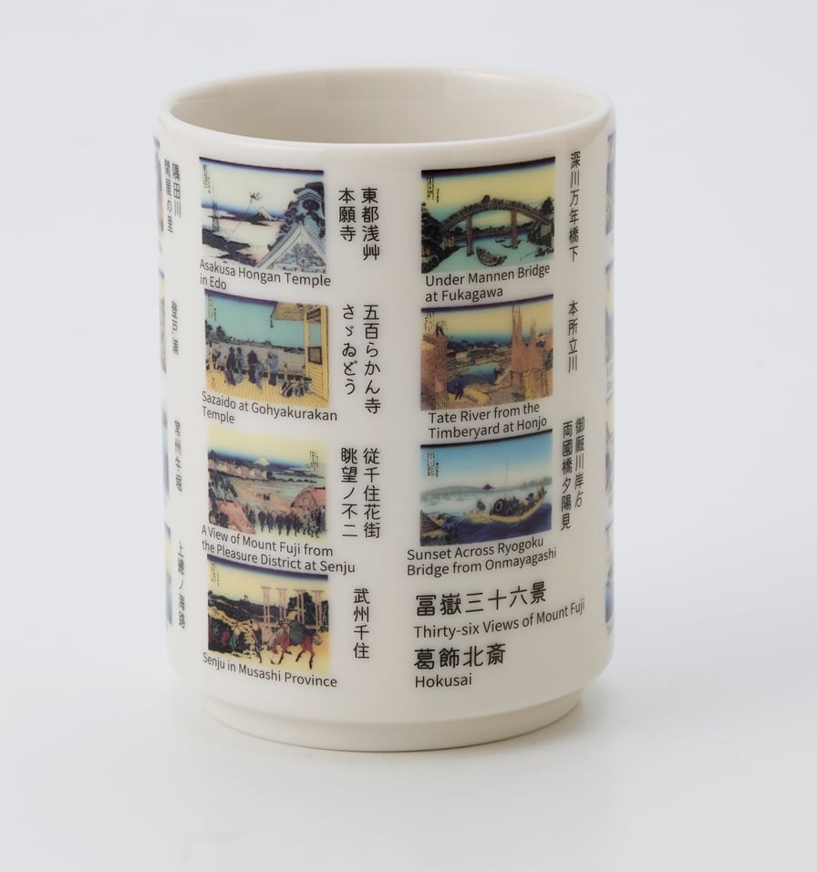 弐の湯呑ではその内、代表作、神奈川沖浪裏を筆頭に日本橋、墨田川、深川 品川等、江戸市中、近郊からの富士の図版を中心に23作品をレイアウトしました。