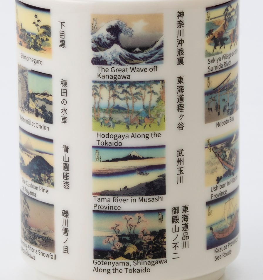 弐の湯呑では、代表作、神奈川沖浪裏を筆頭に日本橋、墨田川、深川 品川等、江戸市中、近郊からの富士の図版を中心に23作品をレイアウトしました。