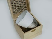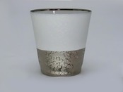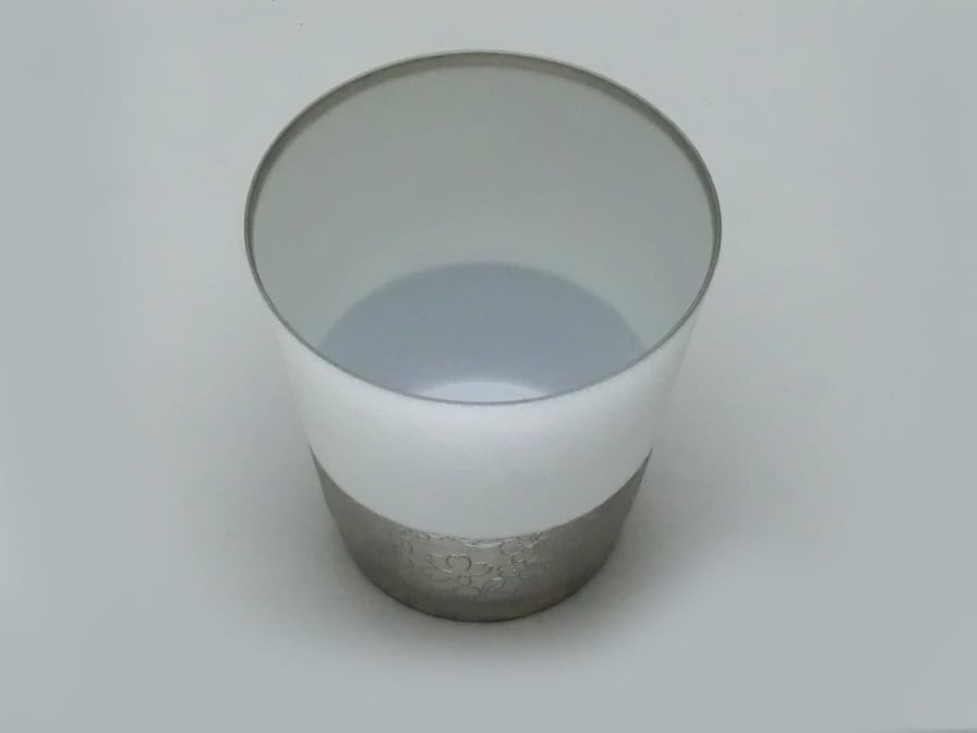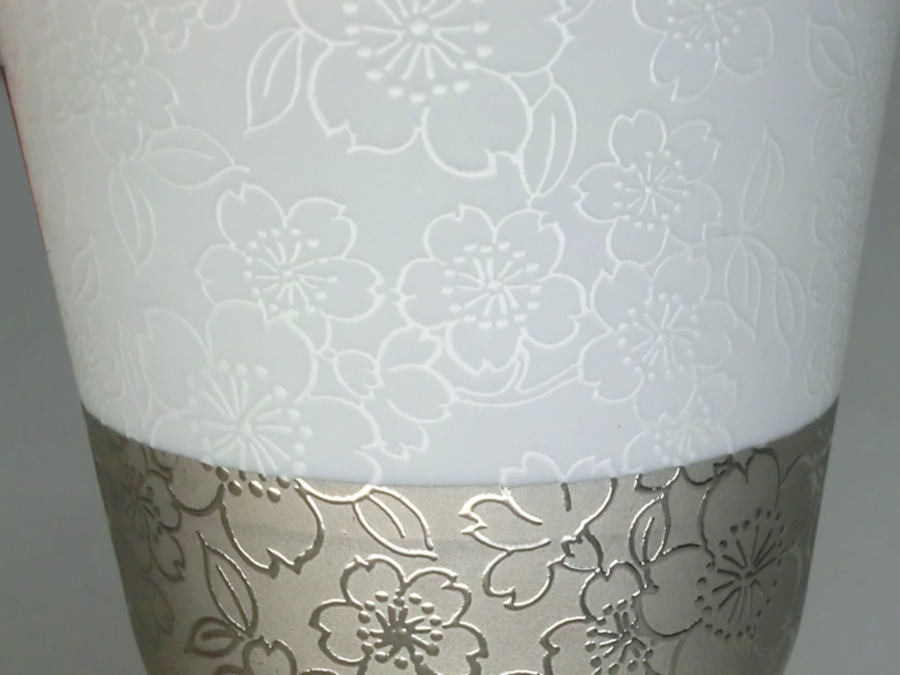 プラチナを使用したうすづくりのカップ 職人の卓越した技術により極限までうすく成形しました。白場と着色部分のコントラスとバランス、白場部分にもあえて銅板転写を貼り、淡いエンボス模様を表現している点が商品のこだわりポイントです。