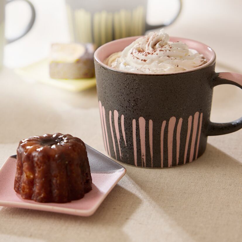 チョコレートフォンデュを思わせる、チョコが溶けだしたようなデザインのマグとチョコをかけたような、お家の小皿の遊び心あふれるセットです。