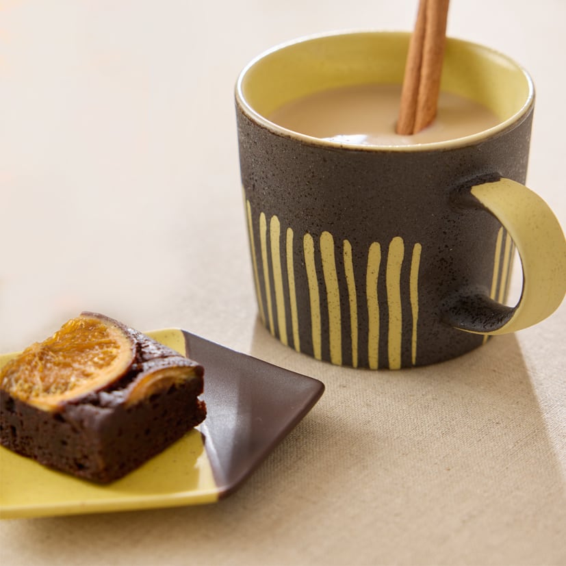 チョコレートフォンデュを思わせる、チョコが溶けだしたようなデザインのマグとチョコをかけたような、お家の小皿の遊び心あふれるセットです。