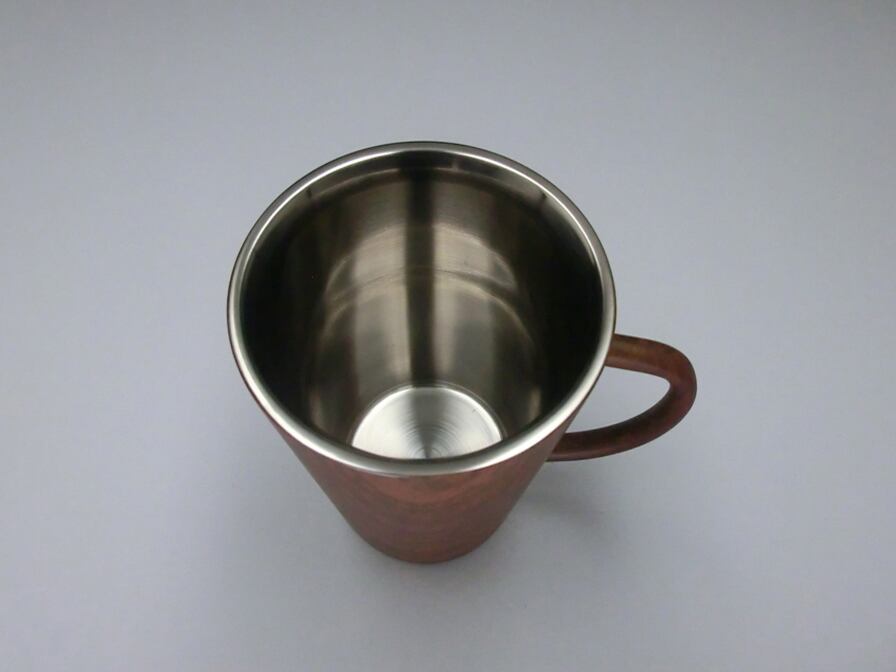 外側の木目調デザインと鏡面仕上げをした内側のステンレス素材の光沢感、金属と木のコントラストが落ち着いたドリンクタイムを演出します。